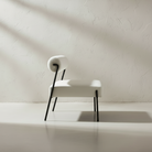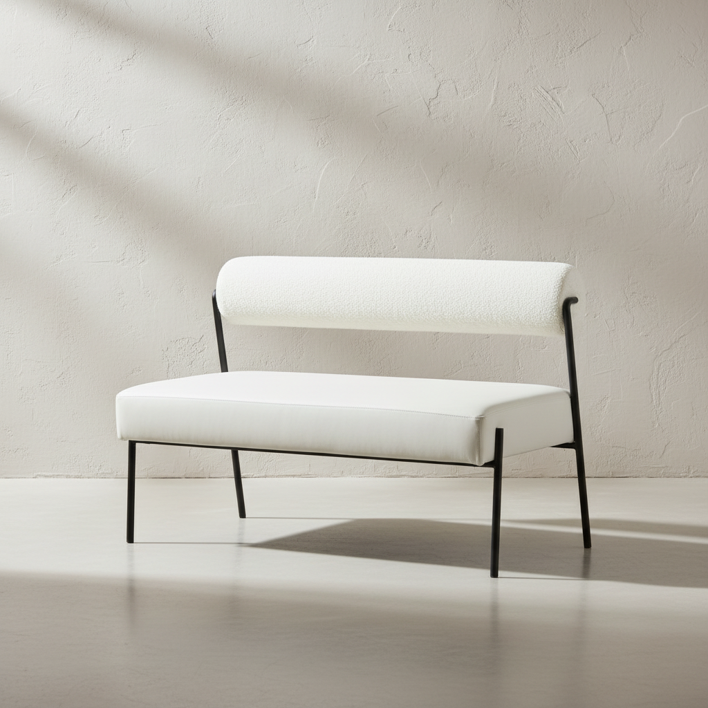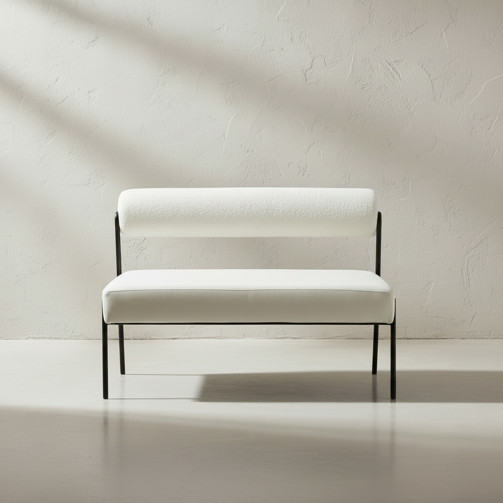 The Vesa Bouclé Bench brings modern artistry into everyday living with its distinctive geometric silhouette. A rectangular seat paired with a cylindrical bolster backrest creates a sculptural profile, while the sleek matte-black frame adds visual balance and architectural clarity. Wrapped in premium buttermilk bouclé with an oyster velour seat, this bench delivers both softness and refined texture, making it a striking addition to any entryway, bedroom, or sophisticated living space.